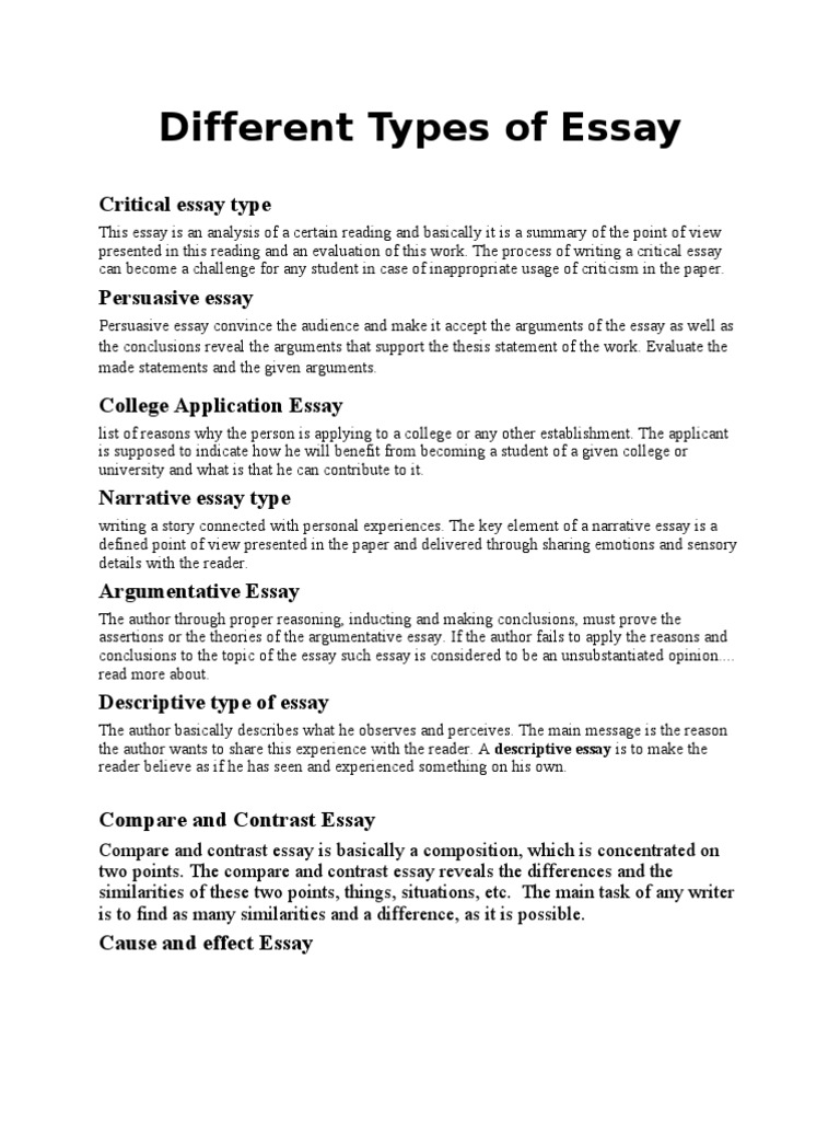 A good place to start thinking about essays is to better understand the types of essays that most of your assignments in high-school, type of essay, and college or university will fit into. The following are the four main categories of essays that are generally the norm in academia thank you, Purdue Online Writing Lab and m ost essays you will ever have to write in your life will fall loosely under these four categories:.